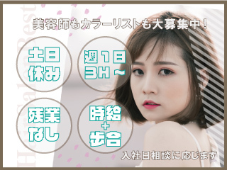 | 待遇 | 【待遇】 各種社会保険完備 (健康保険、厚生年金、雇用保険、労災保険) 交通費全額支給、技術歩合、店販歩合 美容師紹介手当、店舗物件紹介手当 法定時間外手当(1.25倍) 法定休日出勤手当(1.35倍) 1分単位で給与支給、昇給昇格随時、 有給休暇、育児休業、介護休業、 無料健康診断、研修制度、 労務管理相談窓口、ハラスメント相談窓口 他各種手当あり |